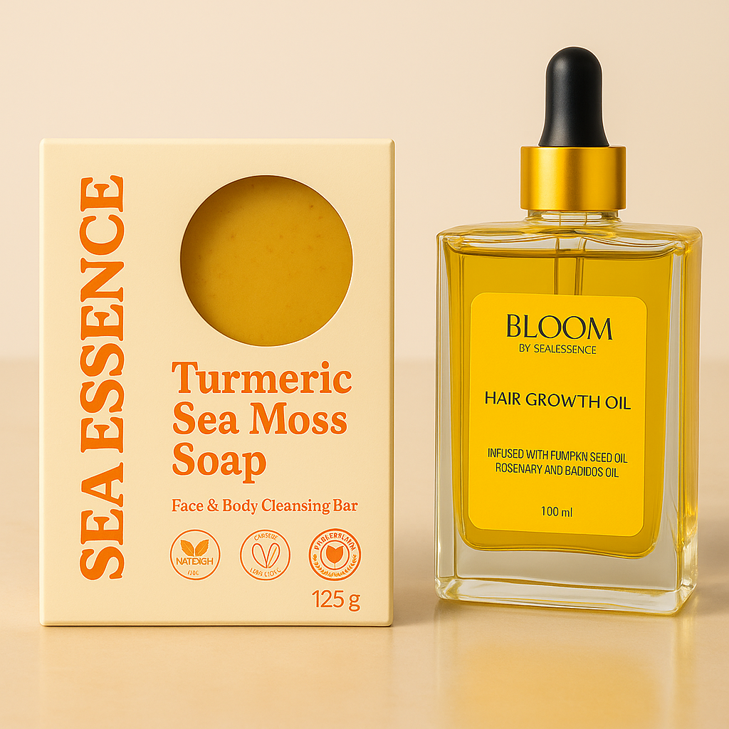 Crafted with Turmeric, Sea Moss, Cocoa Butter, and Tea Tree Oil, this bundle deeply cleanses, fights inflammation, and restores hydration. The Turmeric Sea Moss Soap brightens skin, reduces dark spots and scarring, unclogs pores, and fights acne while keeping it soft and moisturised. At the same time, the Bloom Hair Oil, made with Batana Oil, Pumpkin Seed Oil, and Rosemary Oil, strengthens roots, stimulates growth, and protects against dryness and breakage, promoting thicker, healthier hair.